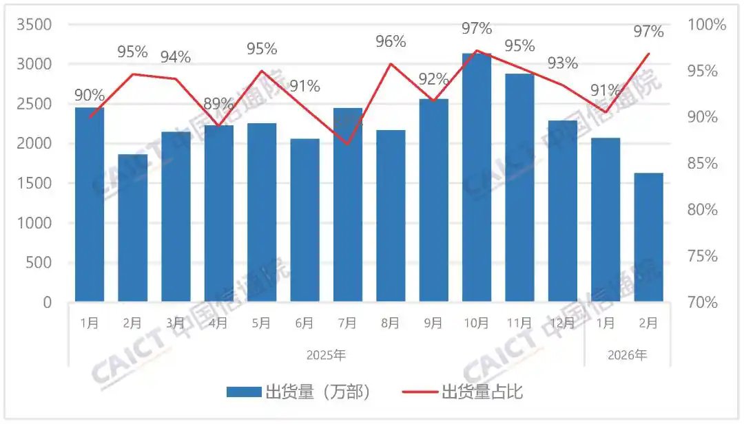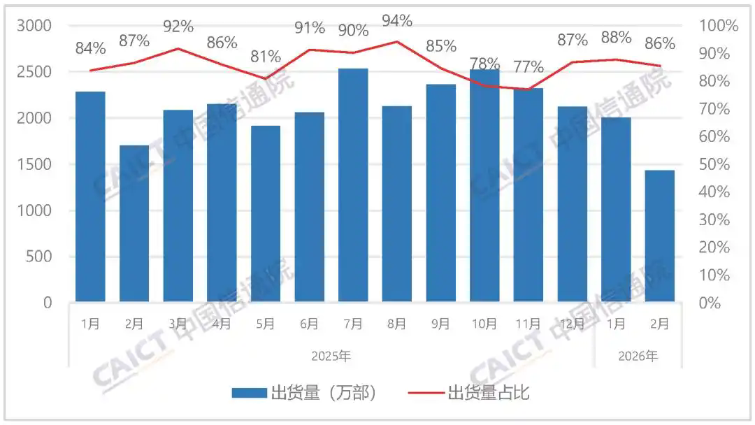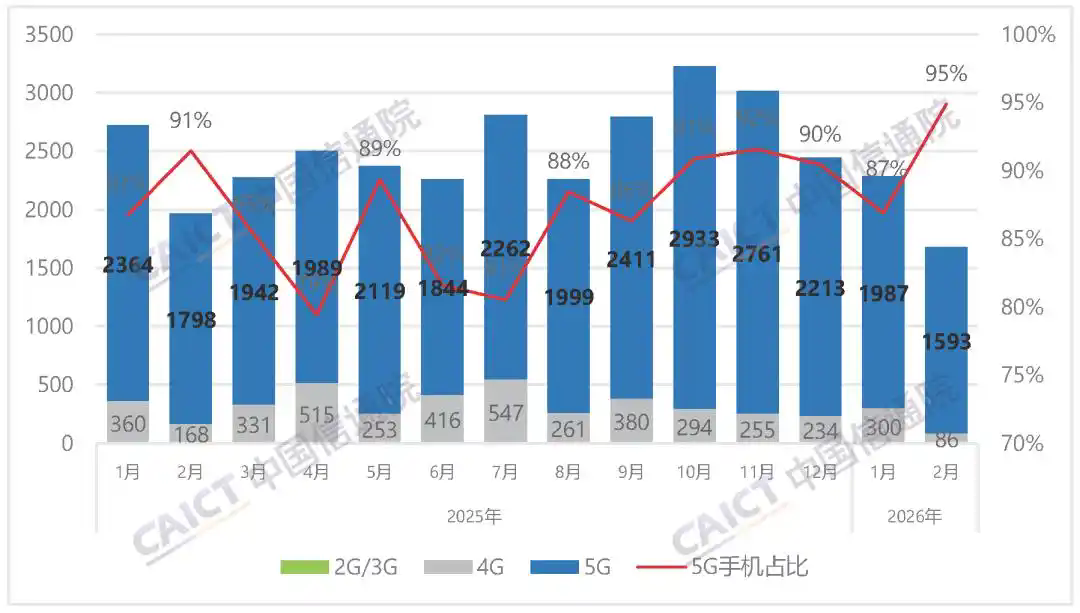 2026年1-2月,国内市场手机出货量3965.5万部,同比下降15.5%,其中,5G手机3580.1万部,同比下降14.0%,占同期手机出货量的90.3%。