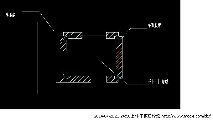 先将单面胶带贴合离型纸,背面贴合PET保护膜,将单面胶带安贴合PET原膜的尺寸打出,贴合PET原膜胶带部位离型纸打半穿,排掉离型纸贴合PET原膜,**次套冲将PET原膜形状和单面胶带形状直接打出,或可分2次套冲。