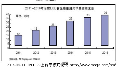 从**LCD背光模组用光学膜需求量来分析,2011年全产能约12万吨,2013年为23万吨,2014年为29万吨,到了2016年将达到36万吨。据专家预测,未来3年,**平板显示产业对光学**聚酯基膜的年需求量将达到30万吨以上。