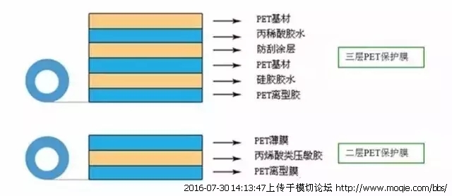 常见的保护膜是由超透明聚酯薄膜(PET)作为基膜,经涂布线涂布特殊的硅胶或亚克力胶,再贴合PET离型膜,并于硬化处理面再贴合PET保护膜所组成的。