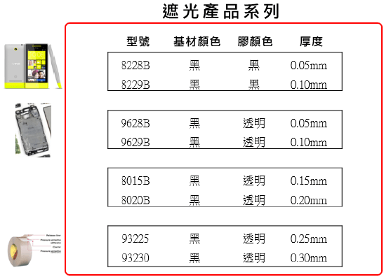 8228B,8229B两款产品的遮光率达到99.9999%,因为此两款产品的设计结构,採用黑膜胶的设计。而 9628B,9629B的胶系来自360胶系,360胶系适合小面积,需要高抗反剥力的应用,此两款产品的胶系在短期间内就可以发挥终极强度的90%表现。而8015B,8020B,93225以及93230则适合需要较高黏性与高机械强度的应用。