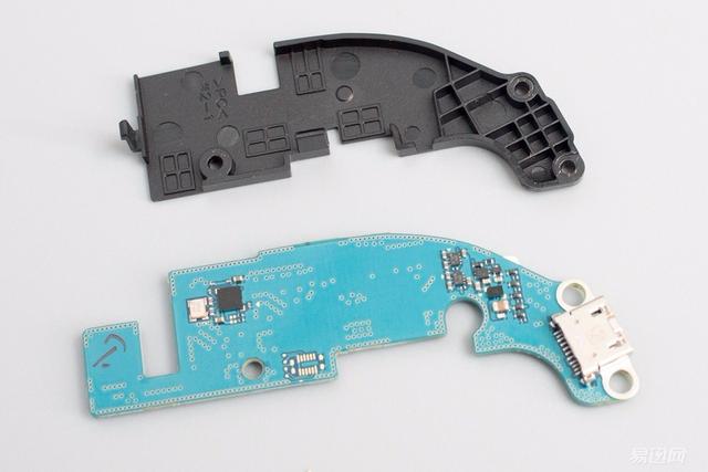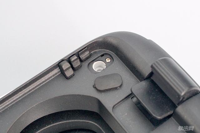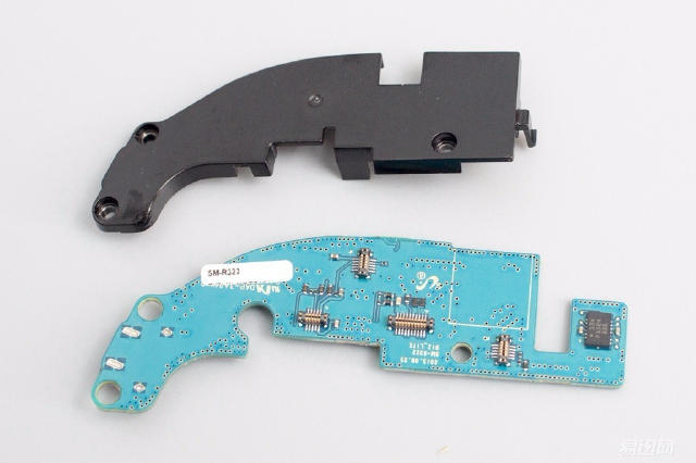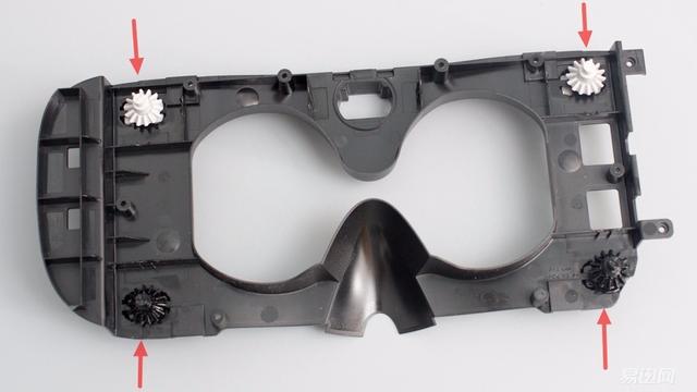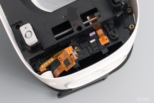 拆掉”手机支架“背面的这四个螺丝,就能把GearVR连接手机的USB接口和音量按键模块拆下来。