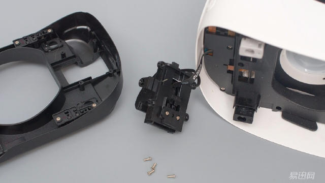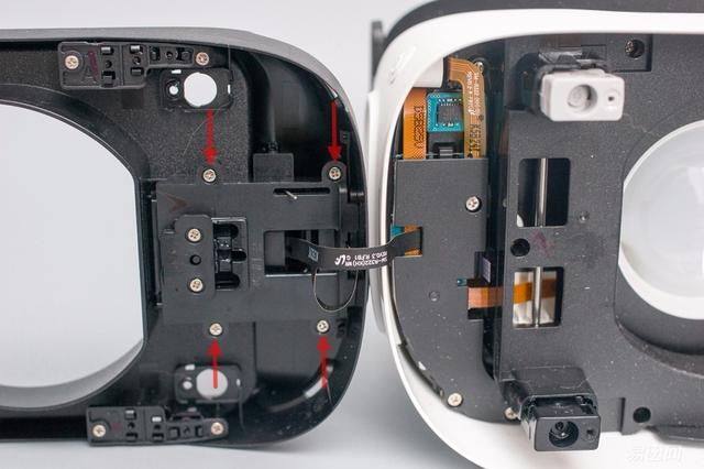 拆到这里就算结束了,目镜侧用来贴魔术粘的黑色边框有部分通过热熔的方式与底座连接,拆解难免会有破坏性,所以就没再拆下去。