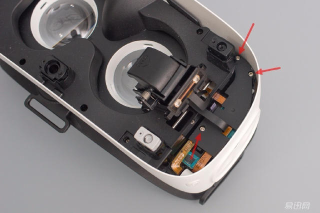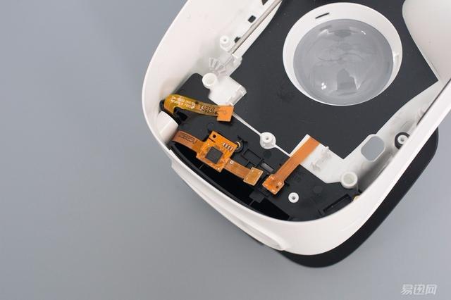 左上排线连接返回按钮,左下排线是触摸板,右边排线连接至GearVR中间那个人体感应器,确保GearVR没有被人佩戴时候会自动熄屏省电。