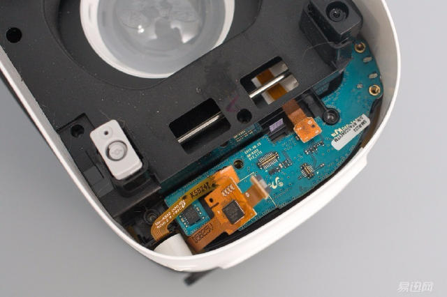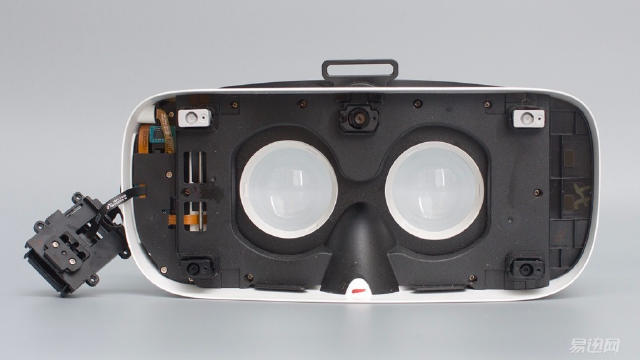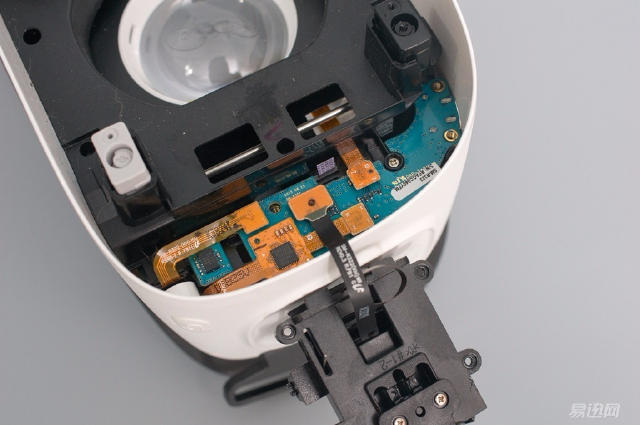 拆掉”手机支架“与主板后的Gear VR里就只剩下外壳和排线了。