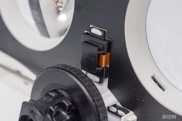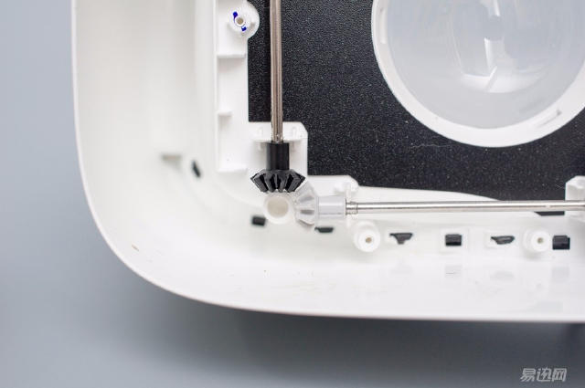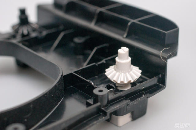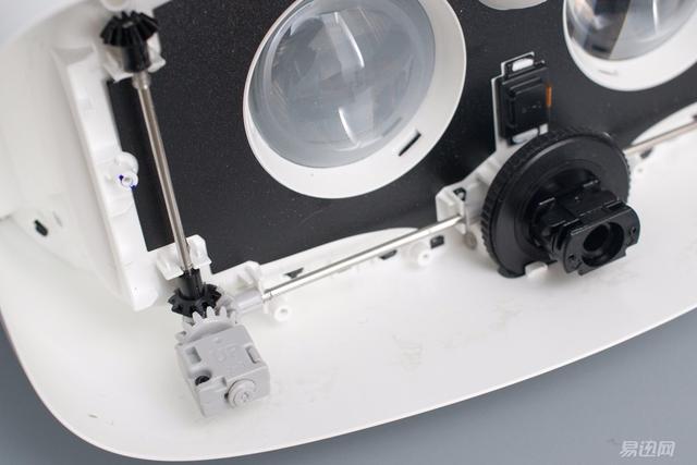 拆下一个齿轮做演示:当旋转图中右边这个屈光度调节旋钮,就会驱动与它连接的转轴,转轴再驱动”手机支架“的齿轮调节手机支架的位置。