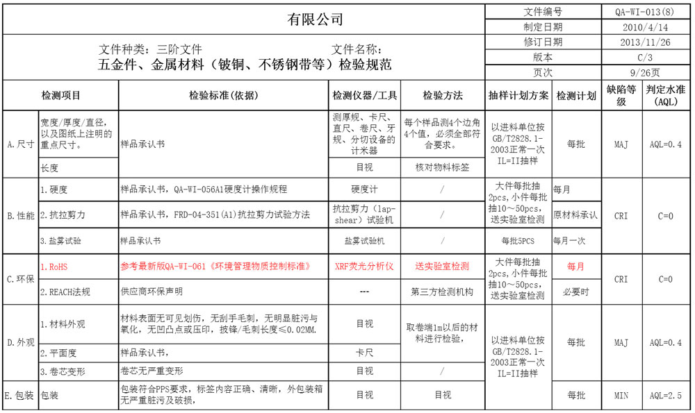 某模切厂金属屏蔽产品原材料检验规范,供大家参考。