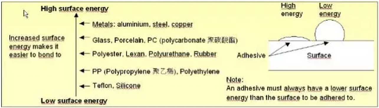 4、 材料的表面能排布:材料表面能越高,越好粘合从高表面能到低表面能大致排序: