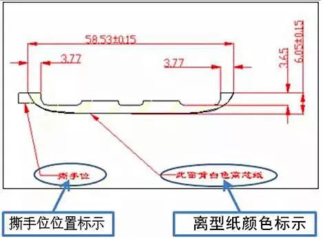 离型纸(膜)在手机组装生产过程中频繁使用, 辅料2D图上必须标示选取的离型纸颜色及合理的手撕位位置,方便生产作业(如上图)。现分以下四种类型介绍: