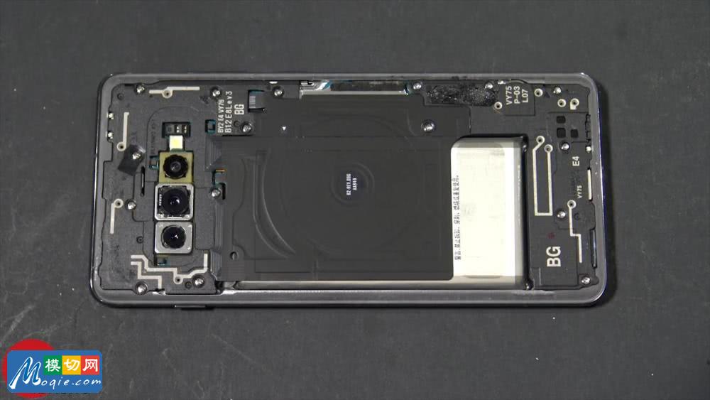 拿掉后壳之后,我们看到了Galaxy S10的内部,首先映入眼帘的是后置三摄像头模块以及用来固定电池的隔板。