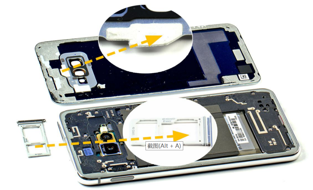 拆解前需要先将SIM卡托取下,可以看到卡托带有胶圈用于防水。S10e的后盖为玻璃材质,通过热风枪加热至200度,即可用撬片撬开。