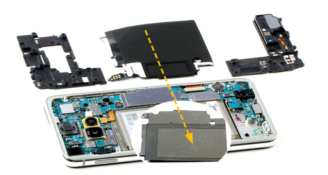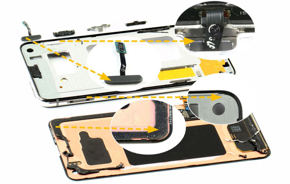 背面设有WiFi/BT/GPS天线、主天线/扬声器模块和NFC/MST/无线充电线圈。可见S10e是支持反向无线充电,可为其它机器充电。