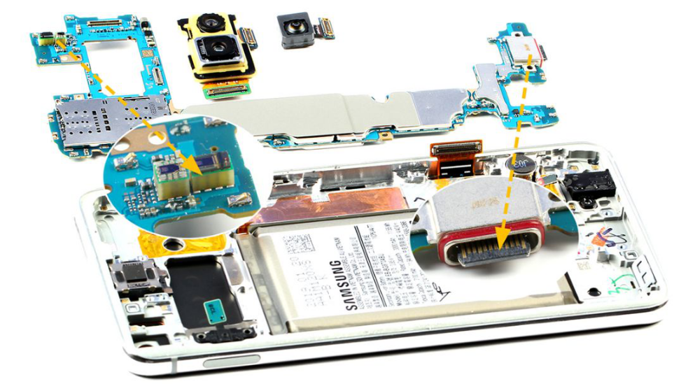 取下主板和摄像头模块,发现S10e的光线和距离传感器通过基板来垫高,而USB Type-C接口带有胶圈防水,支持防水功能。