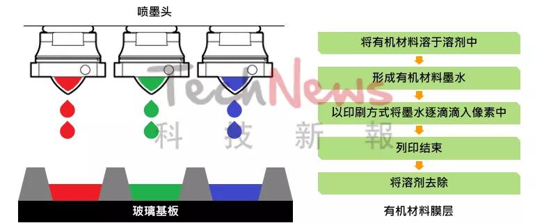 若用蒸镀制程,大尺寸面板的曲翘及精密金属屏蔽等问题容易造成不良,但喷墨印刷就可克服这些困难,且成本更低,其生产不需要真空环境,也不用 FMM,材料利用率也更高,更适合大面积生产。但这并不代表就更容易,喷墨印刷主要是使用溶剂将 OLED 有机材料融化,并直接喷印在基板表面形成像素,但要制成可用的阴极墨水及大面积均匀成膜,都是技术难点。