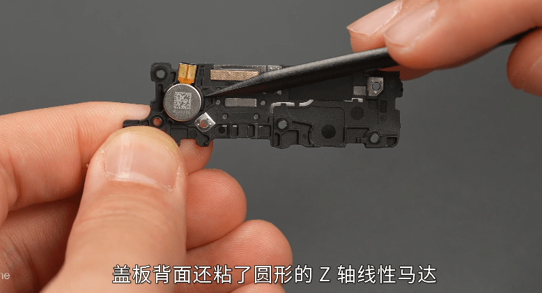 拆下左侧的无线充电模块,四周集成了NFC线圈,使其成为唯一一款支持50W无线快充的折叠屏手机。图上红标部件为激光对焦模组。