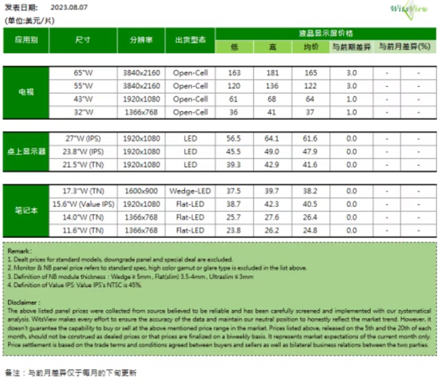 根据TrendForce集邦咨询调研数据,2023年8月上旬,电视各尺寸面板价格继续保持上涨趋势;显示器、笔记本各尺寸面板产品均价与前期相同,具体内容如下: