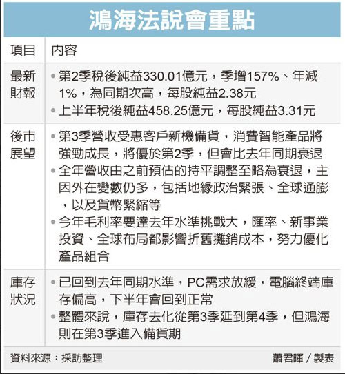 谈到库存议题,鸿海财务长黄德才表示,疫情过去后,库存去化已经回到去年同期水准,现阶段PC需求放缓,电脑终端库存偏高,下半年会回到正常,至于云端网络产品变化不大。整体来说,库存去化从第3季延到第4季,但是鸿海则在第3季进入备货期。