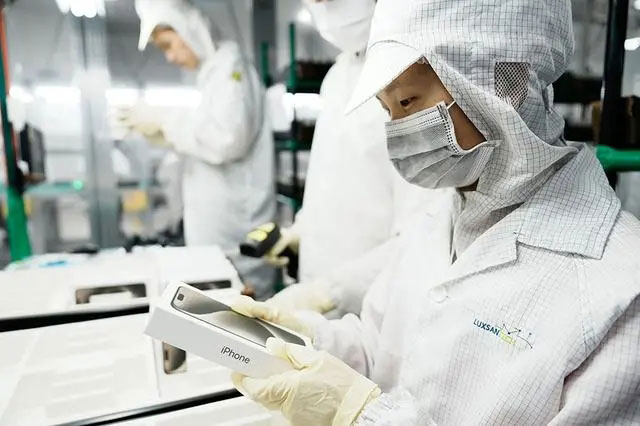 立讯精密工人们正在检查 iPhone 15 系列的外包装
