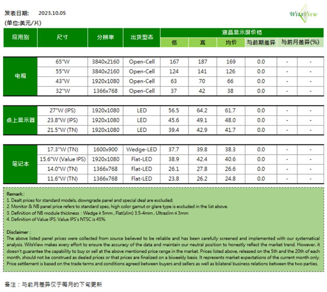 根据TrendForce集邦咨询调研数据,2023年10月上旬,电视、显示器、笔记本各尺寸面板价格维持不变。