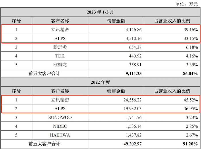 界面新闻记者注意到,皓吉达存在大客户高度集中的问题。报告期各期公司来自前五大客户的收入占当期营收的比例分别高达87.25%、93.58%、91.02%、86.04%。其中来自立讯精密和ALPS的收入占比合计分别高达52.31%、80.65%、82.47%、72.31%。