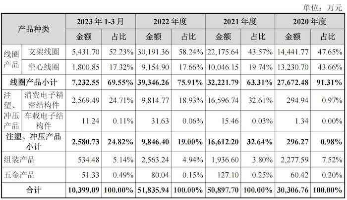 线圈产品是报告期(2020年至2023年一季度)皓吉达最主要的收入来源,各期收入占比分别为91.31%、63.31%、75.91%和69.55%,注塑、冲压产品次之,各期收入占比分别为0.98%、32.64%、19.00%和24.82%,此外,公司还有少量组装产品和五金产品销售。