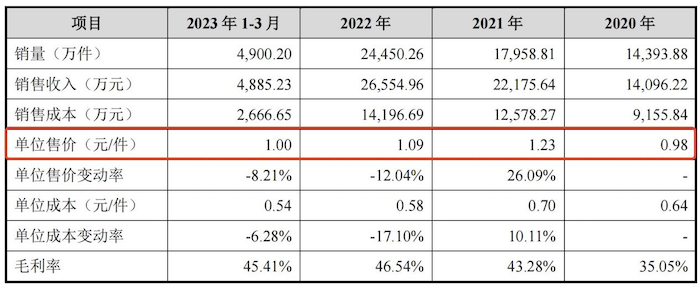 但2022年皓吉达因下游终端客户新一代产品不再采用单价较高的铁芯线圈技术路线,因此支架线圈单位售价下滑至1.09元/件,2023年一季度,支架线圈单价继续下滑至1.00元/件,公司未对此做出解释。
