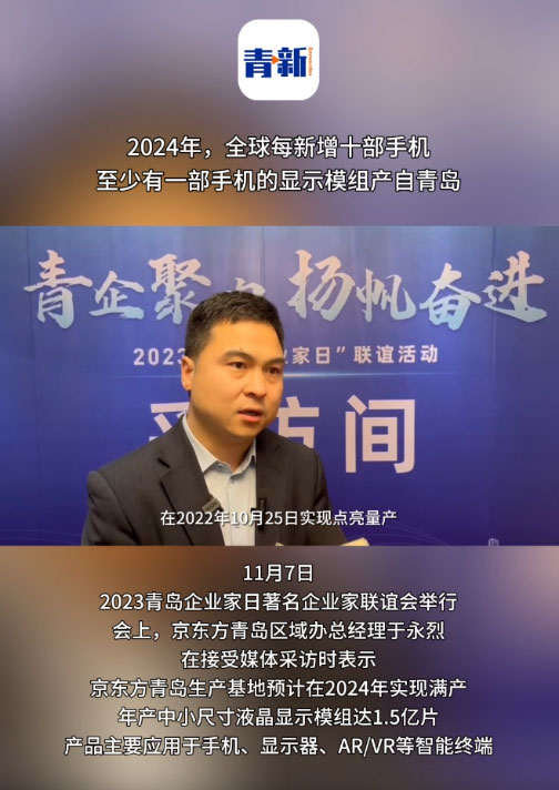 据京东方青岛区域办总经理于永烈介绍,目前企业运营顺利,正加速进行产能爬坡。“预计2024年满产后,可具备年产中小尺寸液晶显示模组1.5亿片的能力,产品主要应用于手机、显示器、AR/VR等智能终端。直观地说,全球每新增十部手机,至少有一部手机的显示模组产自青岛;全球每新增五台显示器,就有一台显示器的显示模组来自青岛。”
