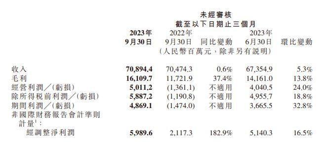 小米集团11月20日发布截至9月底的第三季度业绩公告。数据显示,今年第三季度,小米实现营收708.94亿元,较去年同期微增0.6%;经调整净利润约为人民币60亿元,同比大增超180%。据悉,这是小米六个季度来单季收入首次实现同比增长。与此同时,小米前三季度经调整净利润为去年全年的1.7倍,业绩表现大超市场预期。