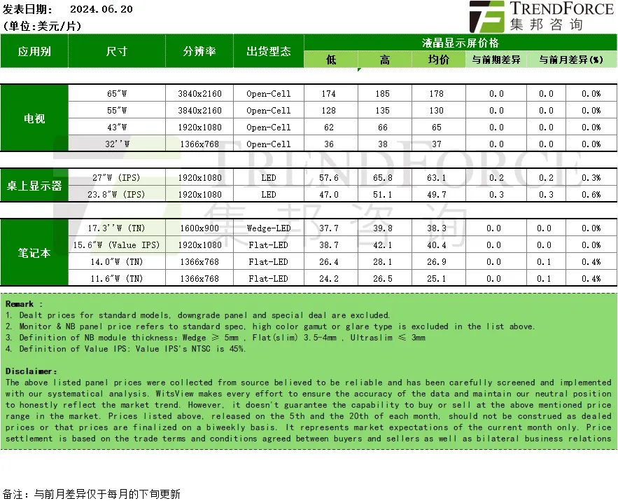 研究机构TrendForce集邦咨询公布2024年6月面板价格趋势,显示器面板价格小幅上涨,电视、笔记本面板价格与前期相同。机构称,6月电视面板需求持续减弱,中国618大促活动未达预期,销量同比减少幅度可能超过双位数百分比,这意味着品牌客户短期内无力扩大或延续前几个月的面板采购动能。