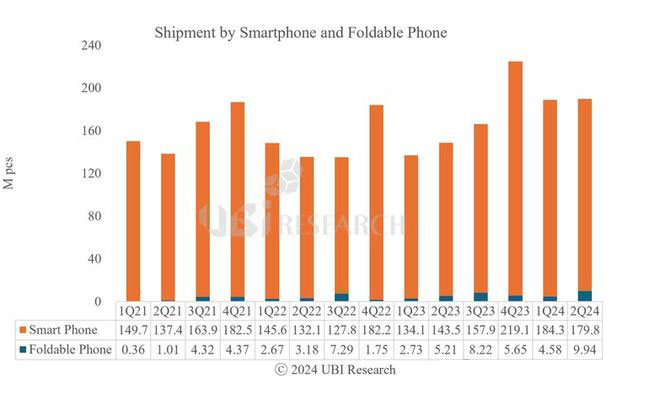 UBI Research称,今年下半年可折叠手机的OLED面板出货量预计将进一步增长,全年可折叠手机的OLED出货量预计将超过4000万片。2028年,可折叠手机的OLED出货量预计将占智能手机OLED总出货量的9.9%。市场占比方面,第二季度可折叠手机的OLED出货量份额在全部OLED面板出货量中仍维持在5%,但销售额却超过了16.3%。预计到 2028 年,可折叠手机 OLED 的销售份额将扩大至 27.5%。