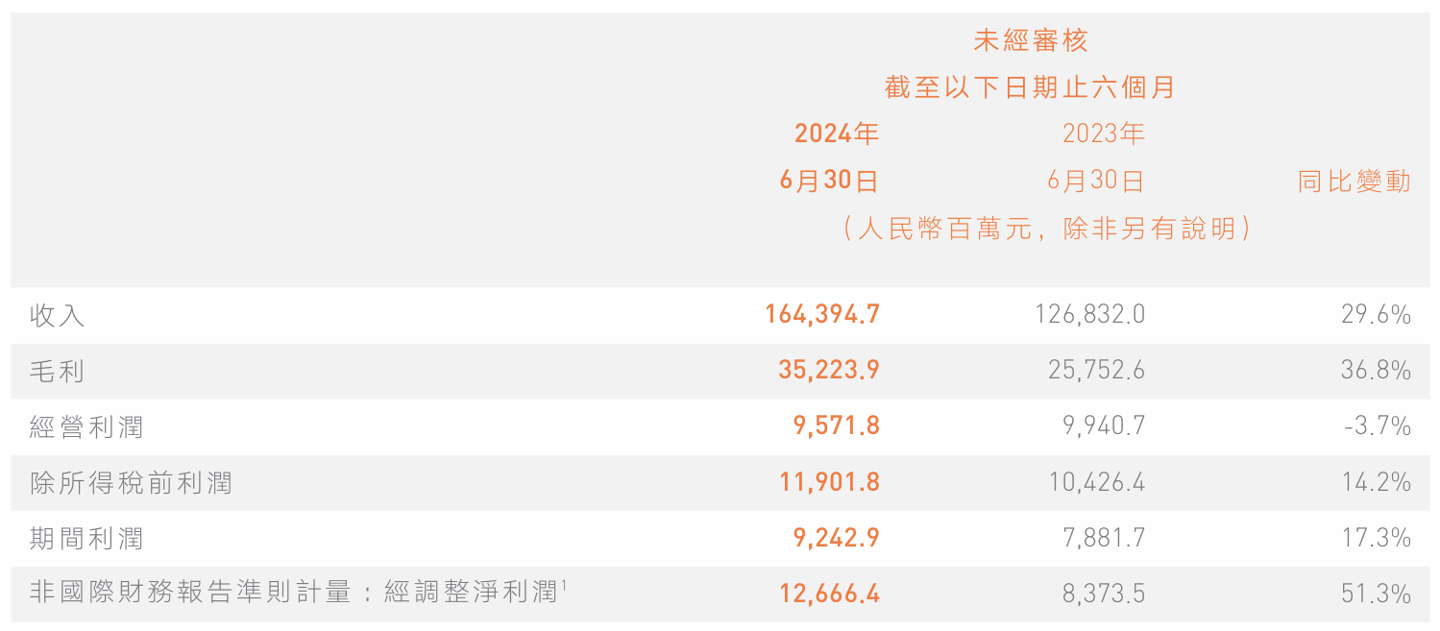9 月 26 日,小米集团发布 2024 年中期报告称,公司上半年营业收入 1643.95 亿元,同比增长 29.62%;上半年归母净利润 92.8 亿元,同比增长 17.86%。附业绩表如下: