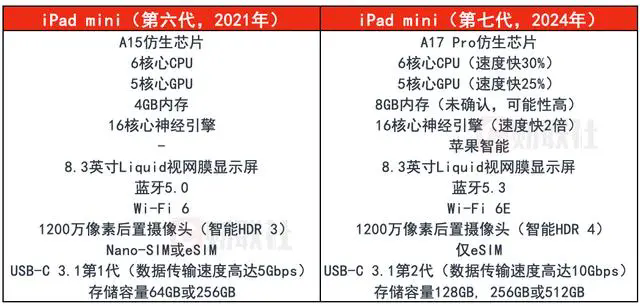 其余规格与上一代相同,包括8.3英寸的Liquid视网膜显示屏(刷新率还是60赫兹)、Touch ID、电池续航等参数完全一致。至于上一代“果冻屏”问题是否完全解决,得等到首批机型上市后我们才能知道了。
