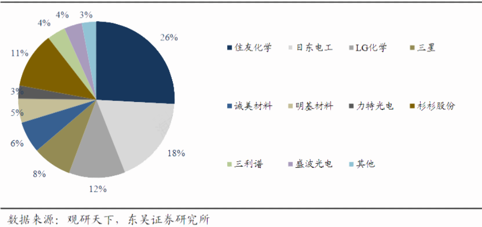 行业周知,由于偏光片技术门槛高,偏光片市场主要被住友化学、日东电工、LG化学等日韩企业占据。根据观研天下数据,住友化学是全球第一大偏光片制造商,其生产的偏光片在23年占全球市场份额首位高达26%,是国内京东方、TCL华星等面板商主要的偏光片供应商。目前大陆厂商以生产TN和STN型偏光片产品为主,大陆能规模化生产TFT-LCD偏光片的企业仅有三利谱和盛波光电两家,面对TFT-LCD偏光片市场的巨大缺口,以及对外企中高端偏光片的依赖,行业国产化仍有很大的发展空间;加之在显示产能持续向大陆转移的趋势下,偏光片上游材料的国产化能有效降低原材料采购成本,大陆面板厂对偏光片国产化需求强烈,替代动能充沛。