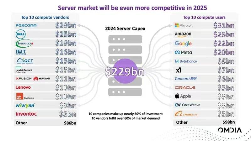 从资金走向看,Omdia表示,2024年服务器投资出现了高度集中化的情况。服务器客户用于服务器的资本开支2290亿美元,支出最多的是云厂商微软、亚马逊、谷歌和Meta,服务器厂商中,富士康、戴尔和超微电脑销售额则排名前三,其中富士康销售额290亿美元,超过戴尔的250亿美元。
