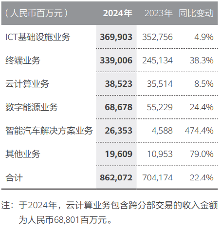就具体业务而言,华为ICT基础设施业务3699.03亿元,同比增长4.9%;终端业务3390.06亿元,同比增长38.3%;云计算业务385.23亿元,同比增长8.5%,如果包含跨分部交易的收入,华为云收入则达到688亿元,同比增长24.4%;数字能源业务686.78亿元,同比增长24.4%;智能汽车解决方案业务263.53亿元,同比高达474.4%,并首次实现当年盈利。
