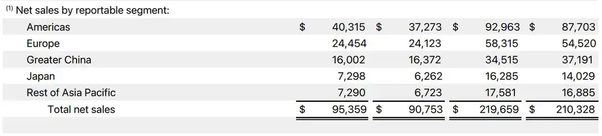 按照市场划分,大中华地区在第 2 财季营收 160.02 亿美元,相比较去年同期的 163.72 亿美元,同比下降 2.26%;北美地区营收 403.15 亿美元,相比较去年同期的 372.73 亿美元,同比增涨 8.16%。
