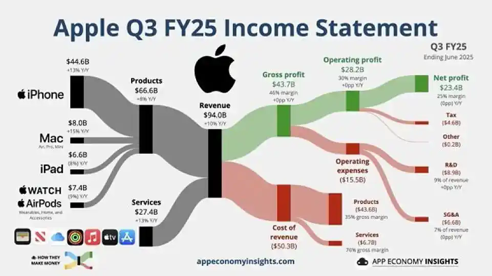 8月1日消息,苹果公司公布了2025财年第三财季(截至6月28日,基本相当于2025年第二季度)的财报。财报显示, 苹果第三财季总营收940.4亿美元,同比增长10%,净利润达244.3亿美元,同比增长9%。财报整体表现远超预期,实现自2021年12月以来最强劲的季度营收增长。
