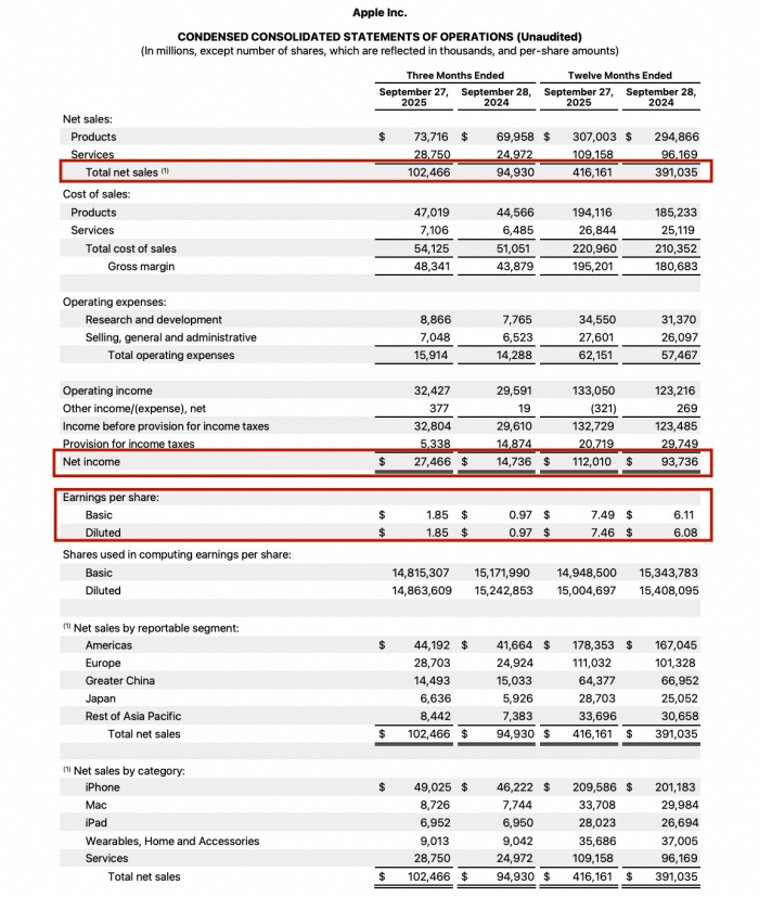 北京时间10月31日,苹果公司发布了截至9月27日的2025财年第四季度及全年财报。财报显示,苹果第四财季总营收为1024.66亿美元,创同期历史纪录,较上年同期的949.30亿美元增长8%;净利润达274.66亿美元,较上年同期的147.36亿美元大幅增长86%。