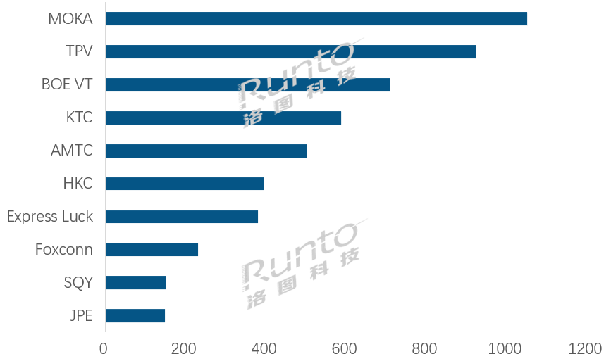 2月,在统计范围内的10家专业工厂中,有六家同比上涨,其中,MOKA(茂佳)、TPV(冠捷)、BOE VT(视讯)、KTC(康冠)等排名领先的前四大工厂均实现了增长。