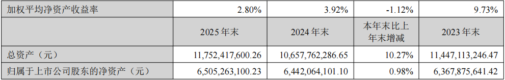 截至2025年末,公司总资产为117.52亿元,归属于上市公司股东的净资产为65.05亿元,资产负债率为45%。货币资金余额为29.46亿元,经营活动产生的现金流量净额为-2.57亿元,主要系现金类销售回款减少所致。