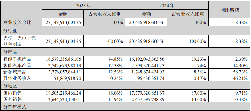 分产品来看,智能手机产品营业收入为165.79亿元,同比增长2.39%,占营业收入比重为74.85%;智能汽车产品营业收入为27.43亿元,同比增长14.3%,占营业收入比重为12.38%;新领域产品营业收入为27.76亿元,同比增长58.73%,占营业收入比重为12.53%。