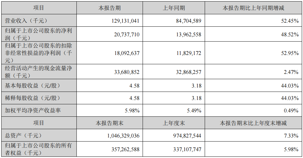 4月15日,宁德时代发布2026年第一季度报告。公告显示,2026年第一季度公司实现营业收入1,291.31亿元,较上年同期增长52.45%;归属于上市公司股东的净利润为207.38亿元,较上年同期增长48.52%;归属于上市公司股东的扣除非经常性损益的净利润为180.93亿元,同比增长52.95%。