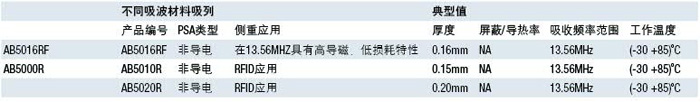 3M AB5000R磁性材料 产品介绍 AB5000R系列电磁波吸收材料是由高导磁材料填充在聚合物基材中形成的一种片状的导磁材料。 • 软磁片填充聚合物形成基材 • 非导电丙烯酸胶粘剂 • 提供离型纸,易于模切和使用 适用范围 3MTM AB5000R系列主要适用于改善13.56的RFID标签的抗金属性。