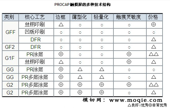 目前触摸屏产业与产品,正处于从薄膜式(GFF)或玻璃式(GG)结构朝向G1F、G2、GF2以及多层结构的AMOLED On-cell技术发展的阶段。GFF的最大优点在于初期投资规模较少,适合多款少批量生产,且有产品较轻的优点。GG结构适合大批量量产、且外观特性较好,但也有初期投资规模大、与薄膜式触摸屏产品相比较重的缺点。过去在触摸屏产品领域GG与GFF式结构的触摸屏为大众,预计未来将慢慢向G1F、G2、AMOLED On-cell等新技术领域扩大。然而无论何种结构的触摸屏,无法同时满足面板企业与客户等所有企业的要求,未来这些优缺各异的多种触摸屏技术将并存,并形成多元化的应用产品市场。并在此过程中解决工艺与技术问题,成为左右每个企业竞争力的重要因素。