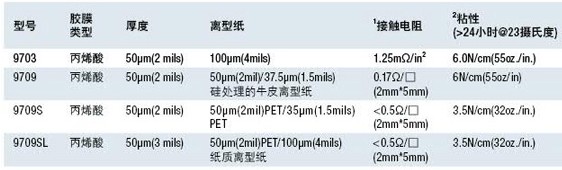 3M 9709产品介绍 3M 9709导电胶膜是在丙烯酸基材中添加银导电颗粒形成的具有优异导电性和使用性能的导电胶膜产品,其中通过控制导电粒子的数量和分布,9709具有好的X-Y-Z三方向导电性,为了便于模切操作和组装方便。 适用范围 3M 9709系列丙烯酸导电膜典型应用在需要导电连接的地方;9709系列则更强调用于需要优异XYZ三方向导电的地方,在保障好的Z方向导电粘接的同时,好XY面导电性使得该胶膜产品具有好的电磁屏蔽功效。